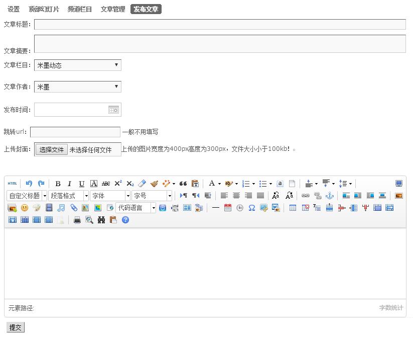1.2、發布文章的字段有文章標題摘要、發布時間、作者、瀏覽量、跳轉鏈接、上傳封面及文章內容編輯器。