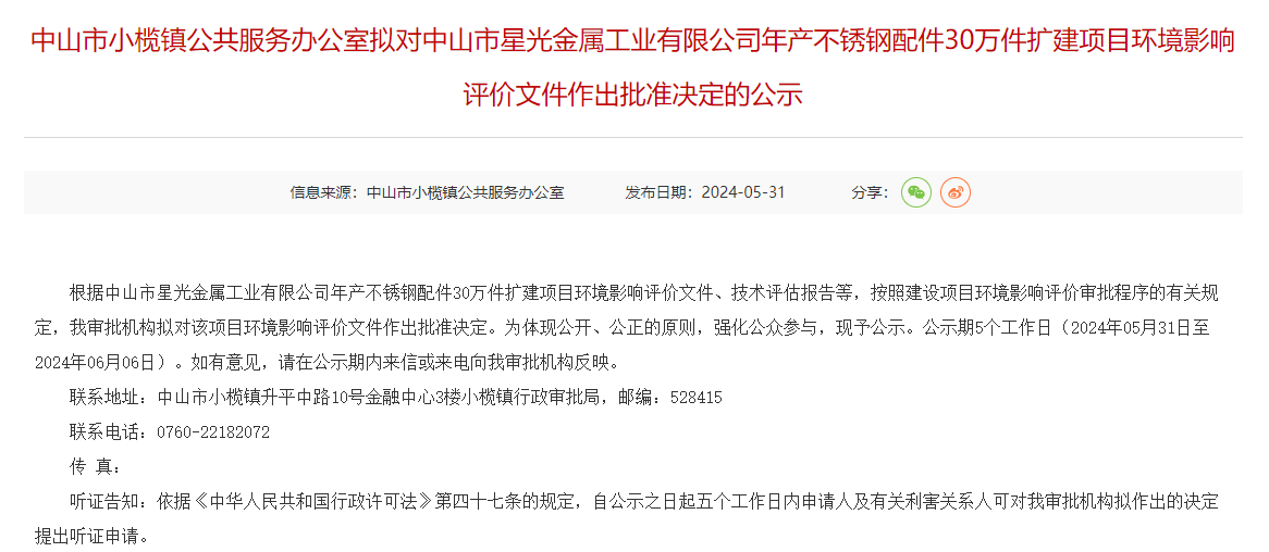 5月31日,中山市小欖鎮(zhèn)公共服務(wù)辦公室擬對中山市星光金屬工業(yè)有限公司年產(chǎn)不銹鋼配件30萬件擴建項目環(huán)境影響評價文件作出批準(zhǔn)決定并對外進(jìn)行公示,公示期:5個工作日(2024年05月31日至2024年06月06日)。