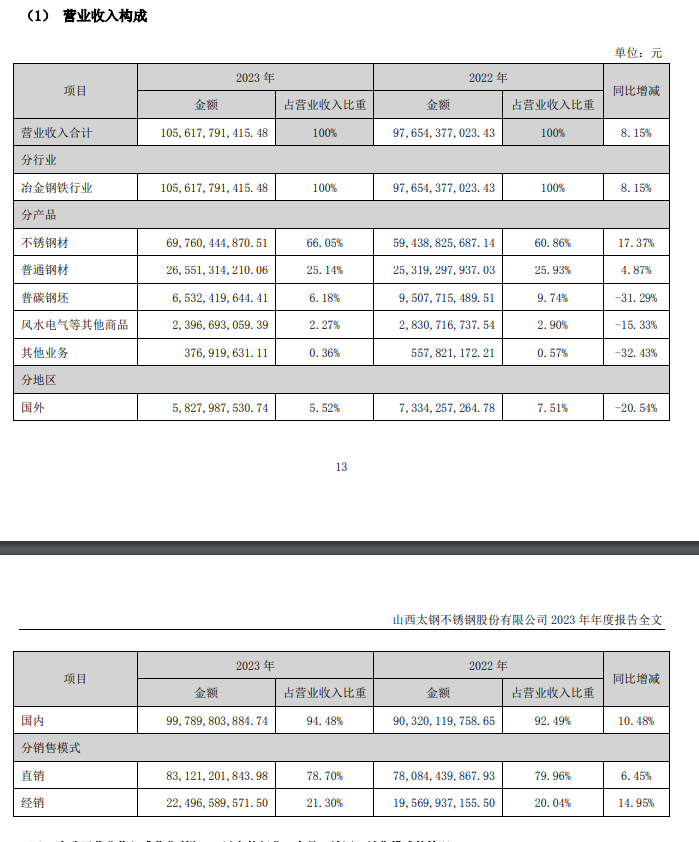 4月26日,太鋼不銹(000825)發布2023年年度報告,2023年實現營業收入1056.18億元,同比增長8.15%;實現凈利潤-10.81億元;基本每股收益-0.190元;加權平均凈資產收益率ROE為-3.16%;經營活動產生的現金流量凈額為26.66億元,同比下降47.83%;投資活動產生的現金流量凈額為-20.07億元;籌資活動產生的現金流量凈額為-33億元。