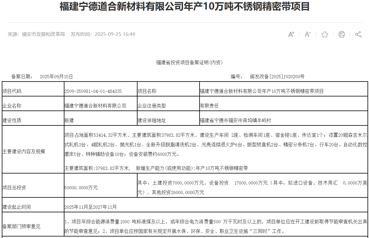 2025年9月15日,福建寧德道合新材料有限公司年產10萬噸不銹鋼精密帶項目獲備案。